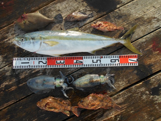 寺倉・・・アオリイカ、2杯。ワラサ他、色々。網干し・・・アオリイカ、1000g 1杯。当りは、5回。内瀬・・・当りは、1回。桃の木・・・大アジ、35cm~38cm 3本。松の鼻・・・アオリイカ、600g 1杯。カワハギ、など。中ばな・・・アオリイカ、1000g 1杯。