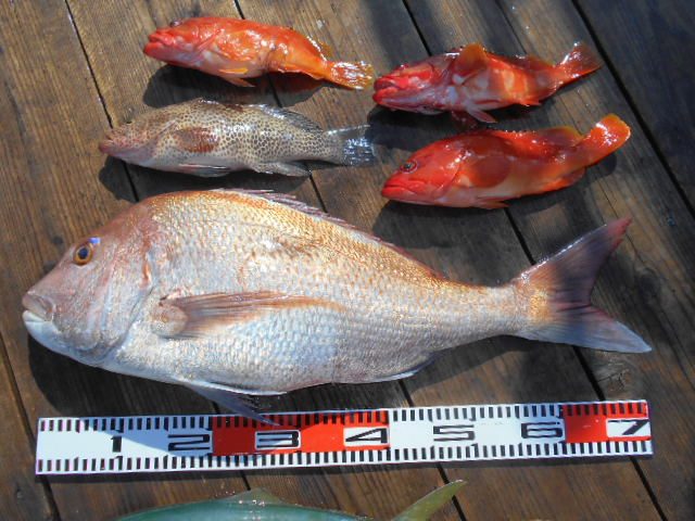*大マダイ、75cm 1枚。(5170g)オオモンハタ、イナダ、アカハタ、カサゴ、メイチダイ、など。大漁。 今日は、大マダイが、60分間の格闘の末に、ようやく釣り上がりました・・・。お疲れ様でした。 またのお越しを、待ってます。 -