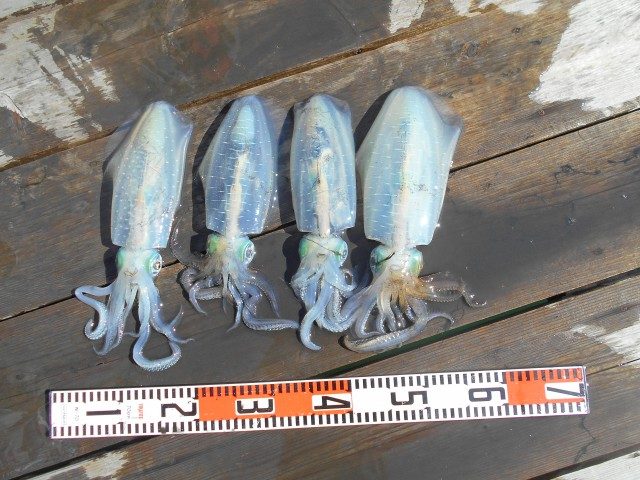アオリイカ、750g頭に、4杯。今日は、厳しい状況の中でしたが、1名様のお客様が頑張って釣り上げてくれました・・・。お疲れ様でした。またのお越しを、待ってます。 -
