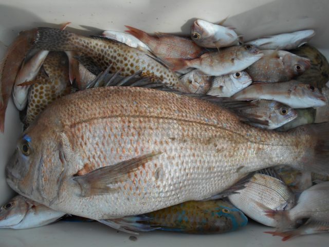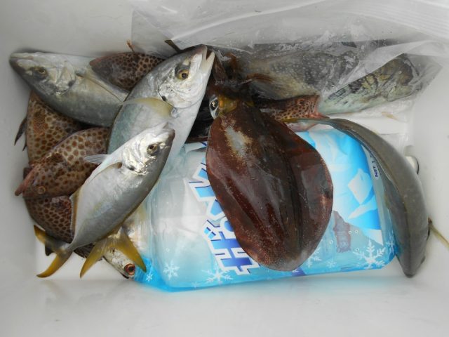 桃の木・・・アオリイカ、1杯。シマアジ、28cm 少々。オオモンハタ、など。網干し・・・アオリイカ、2杯。(エギで。)今日は、桃の木では、良型のシマアジが釣れていました・・・。 お疲れ様でした。またのお越しを、待ってます。