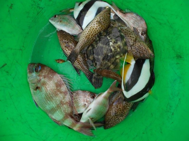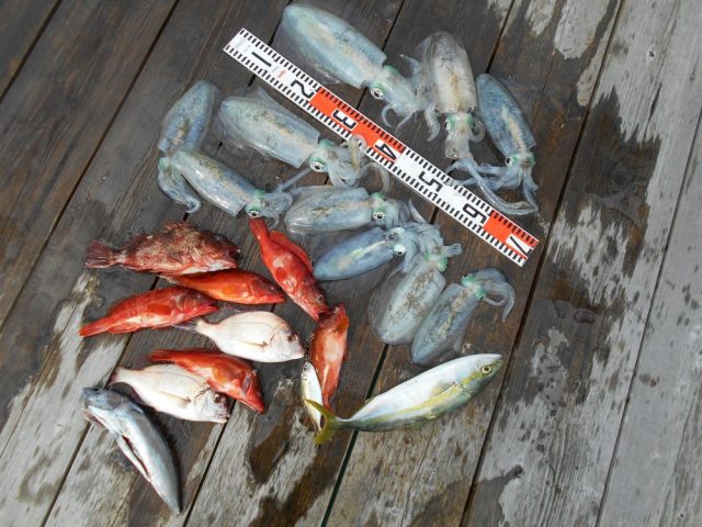 アオリイカ、300g~740g 10杯。イナダ、アカハタ、カサゴ、など。今日は、良型のアオリイカが釣れました・・・。お疲れ様でした。またのお越しを、待ってます。 -