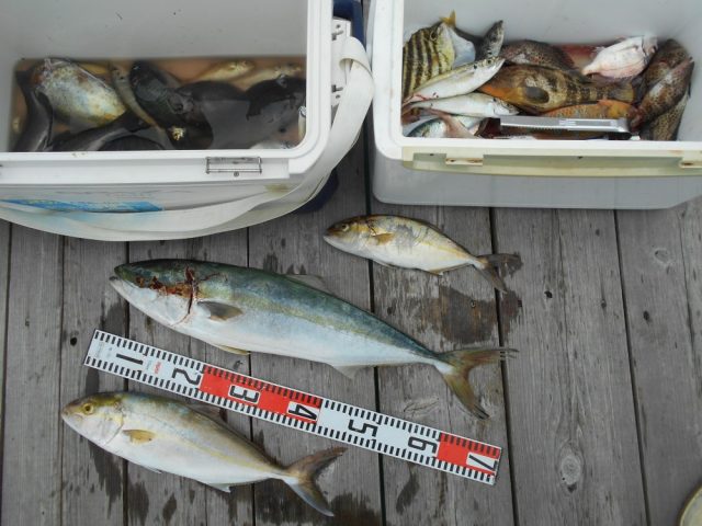 桃の木・・・ワラサ、70cm 1本。シオ、マアジ、20cm 60匹。グレ、アイゴ、オオモンハタ、など。今日は、色々な魚が沢山釣れていました・・・。お疲れ様でした。またのお越しを、待ってます。 -
