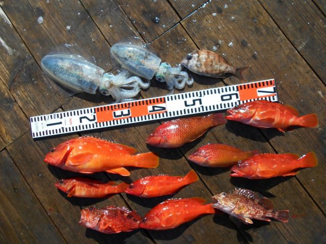 アオリイカ、2杯。アカハタ、メイチダイ、カサゴ、など。今日は、風が強く釣りづらい日でした・・・。お疲れ様でした。またのお越しを、待ってます。 -