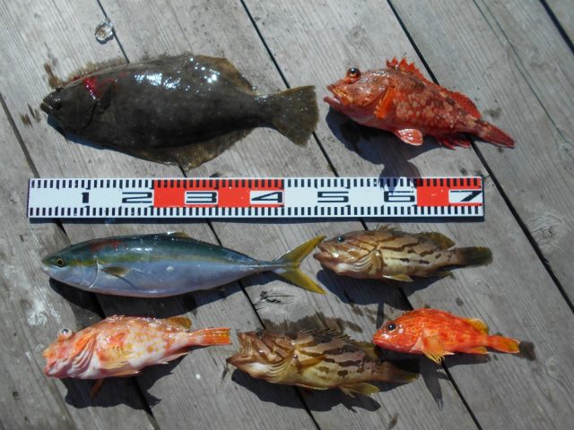 ヒラメ、カサゴ、イナダ、ホウキハタ、など。今日は、風が強く釣りづらい中でしたが、何とか、釣れました・・・。お疲れ様でした。またのお越しを、待ってます。 -