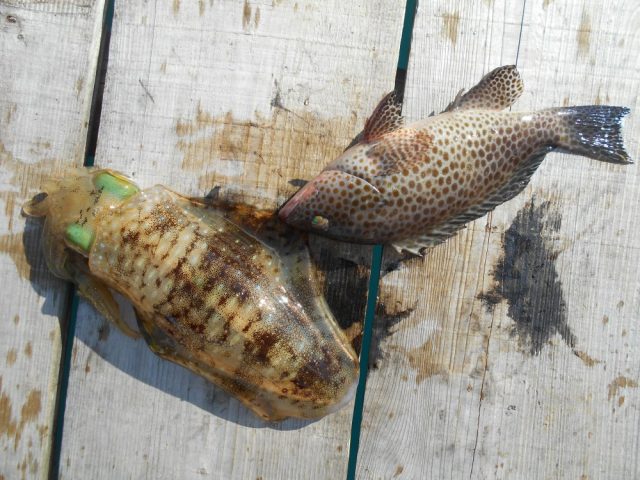 中ばな・・・ヤエンで。アオリイカ、1800g頭に、3杯。当りは、7回。今日は、デカイカが釣れていました・・・。お疲れ様でした。またのお越しを、待ってます。 -
